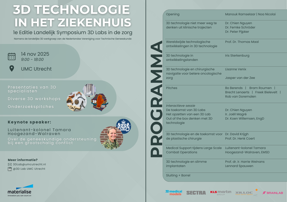 Op 14 november 2025 organiseren we in het UMC Utrecht het eerste landelijke symposium 3D Labs in de Zorg. Dit evenement brengt zorgprofessionals, onderzoekers en technologische innovators samen om de nieuwste ontwikkelingen op het gebied van 3D-technologie in Nederlandse ziekenhuizen te verkennen.
